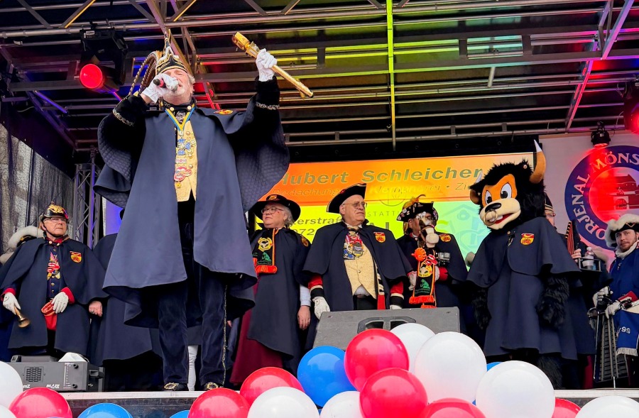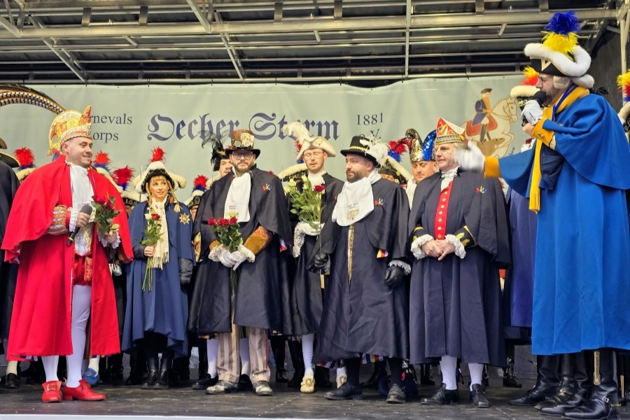 14.02.2026 - Alle Jahre wieder treffen sich proklamierte närrische Häupter zum imaginären Prinzentreffen am Neumarkt auf der Bühne des K.K. Oecher Storm. Heute zum Valentinstag marschierte Prinz Lukas I. mit seinem Hofstaat und der Prinzengarde der Stadt Aachen und verteilte Rosen an die Damen im Publikum.